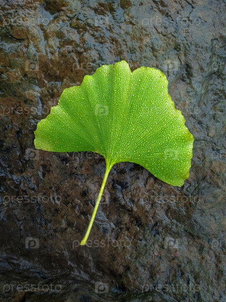 Зеленый лист реликтового растения Гинкго билоба лежит на мокром камне. Лист удачи