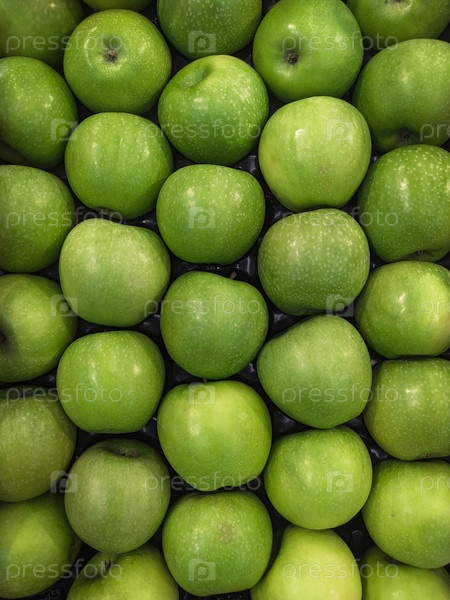 Фон из большого количества зеленых яблок. Фон из фруктов на витрине. Соберите зеленые яблоки
