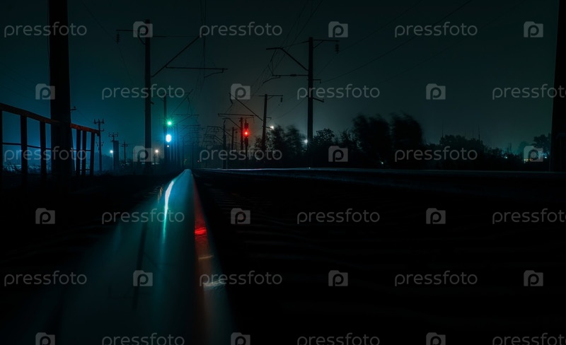 Пустая железная дорога ночью. Красный и зеленый светофор. Сильный ветер качает деревья