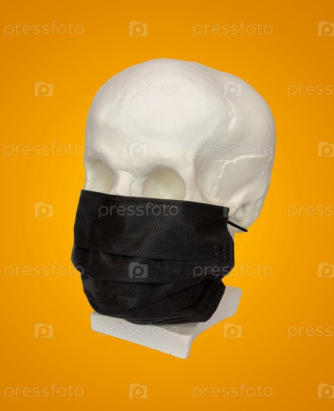 Гипсовый череп в черной маске на оранжевом фоне