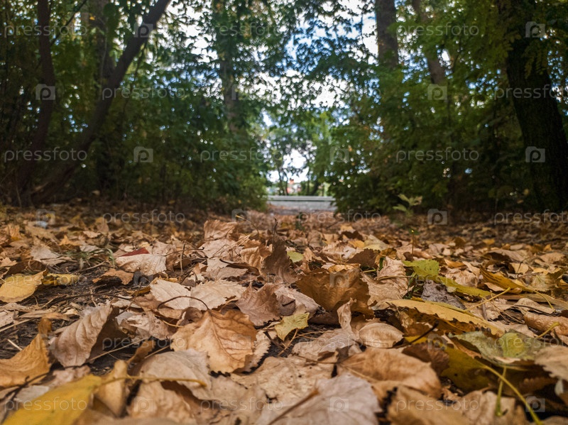 Опавшая осенняя желтая листва на тропинке в парке. Пожелтевшие листья лежат на земле