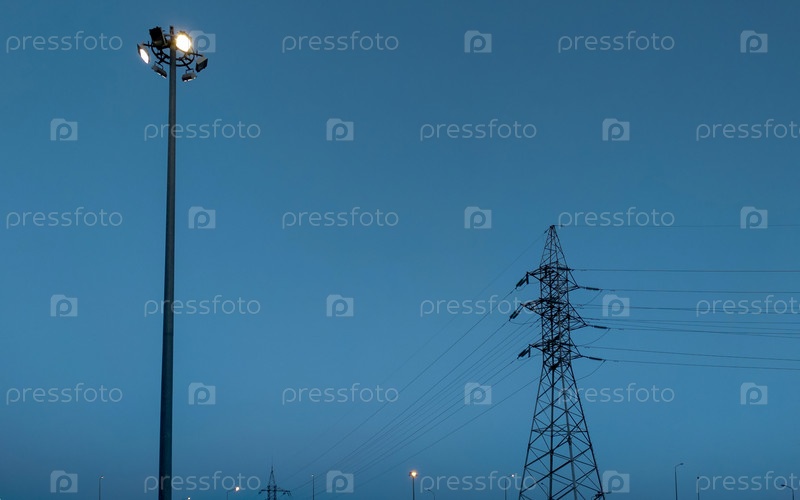 Высоковольтная линия электропередач с металлической опорой и фонарный столб со светящейся лампой на фоне голубого вечернего неба с местом для текста
