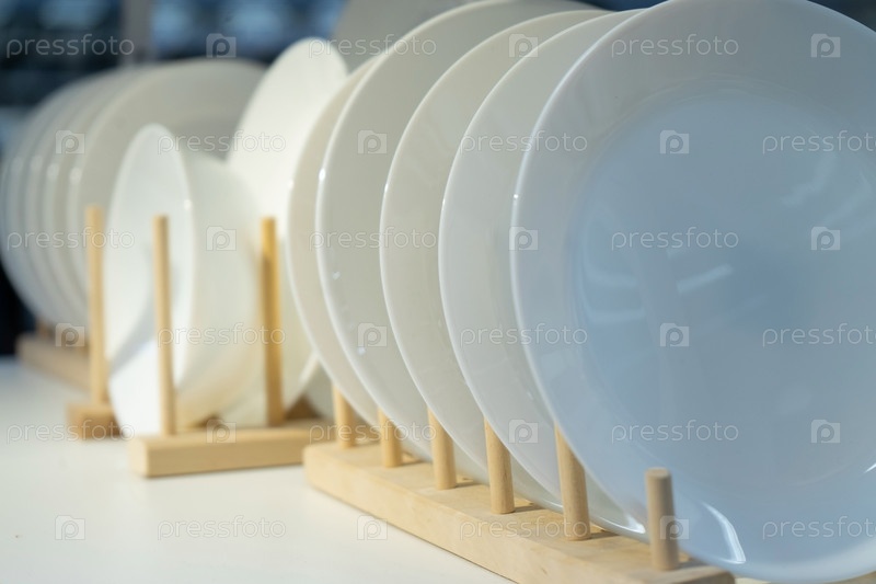 Много белых тарелок на стойке
