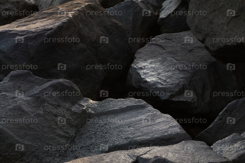 Крупные валуны крупным планом. Мокрые камни в темных тонах