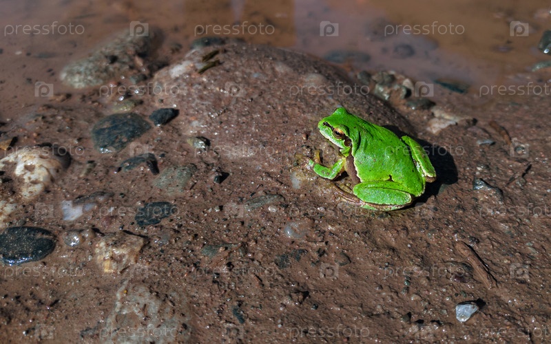 Зеленая древесная лягушка. Древесная лягушка на мокрой земле. Амфибия на земле в лесу