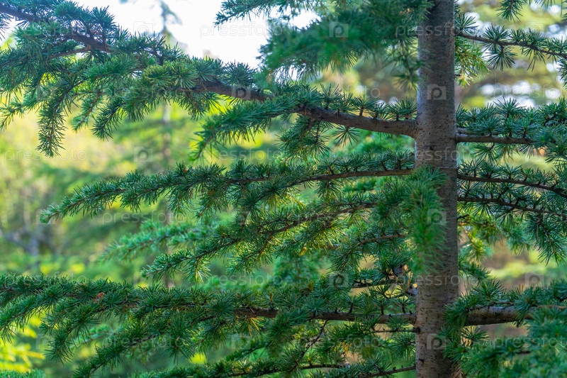 Зеленая молодая хвоя. Пушистые иголки на стволе молодого ливанского кедра
