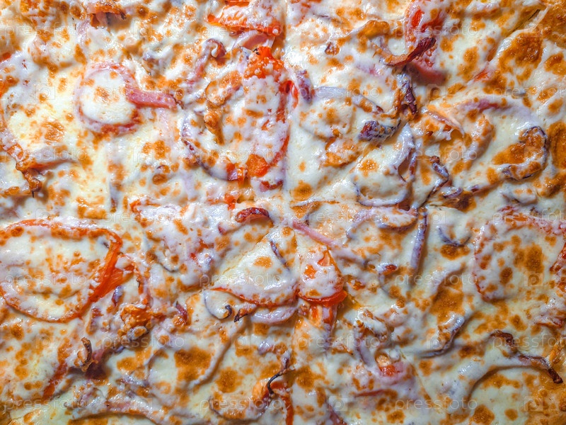 Горячая нарезка пиццы с плавленым сыром, местами хрустящая, с помидорами и ветчиной. Фон пиццы