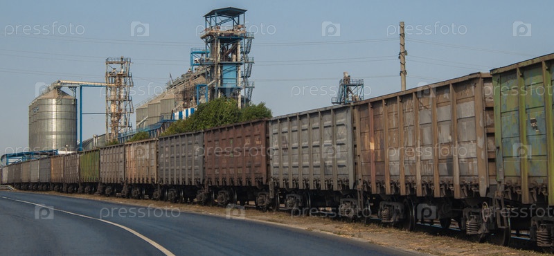 Многие товарные вагоны поезда стоят рядом с большими силосами
