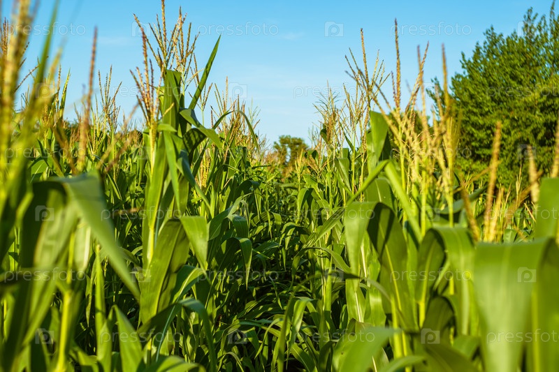 Поле с рядами молодой зеленой кукурузы на синем фоне. Бизнес по выращиванию кукурузы на частной ферме