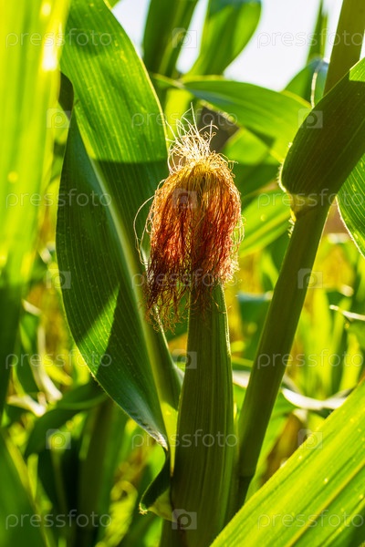 Крупный план кукурузного початка в поле на стволе растения, освещенного солнечным светом. Выборочный фокус. Бизнес по выращиванию кукурузы на частной ферме