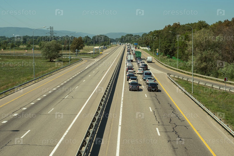 Односторонняя пробка на скоростной автомагистрали. Пробка на шоссе. Голубое небо и горы на заднем плане
