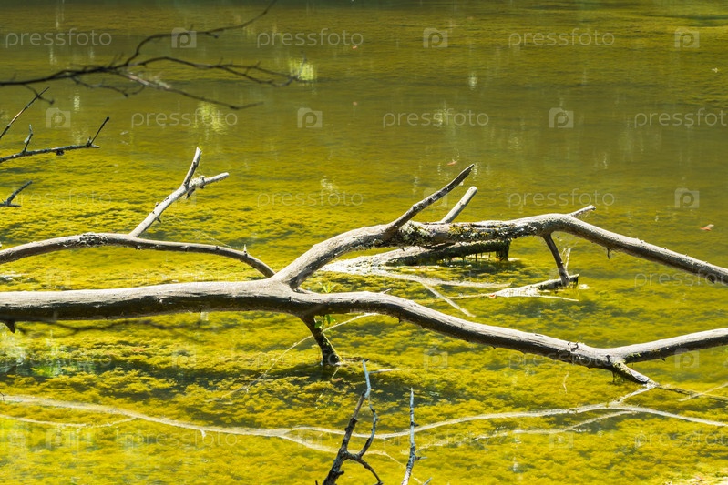 Прозрачная вода в лесном озере, сквозь которую можно увидеть зеленые водоросли. В воде лежит сухая коряга