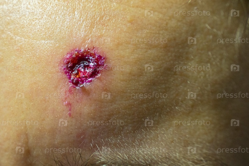 Крупный план свежей раны после удаления родинки на лбу женщины. Место удаления обработали раствором перманганата калия. Концепция удаления родинки