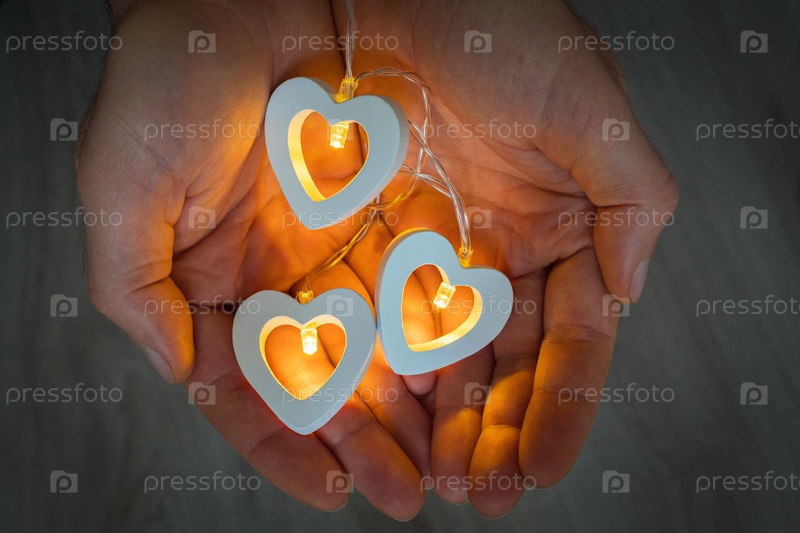 В ладонях мужчин лежат три светящихся желтых сердца. Концепция Дня святого Валентина. 14 февраля – День всех влюбленных. Крупный план, вид сверху