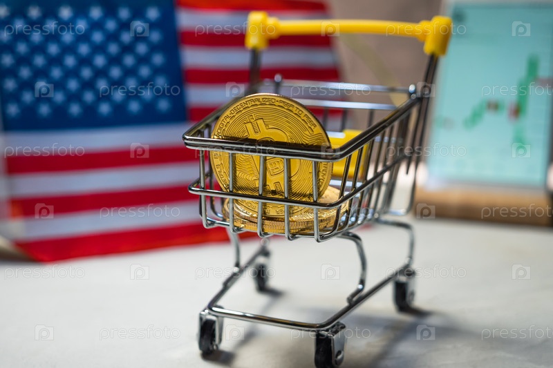 Корзина с золотыми криптовалютными монетами Bitcoin на фоне флага США и смартфон с графиком обменного курса BTC