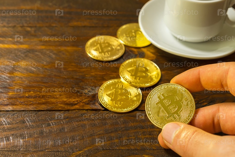На густом деревянном фоне лежит горстка монет BTC и чашка белого кофе Использование криптовалюты Биткойн в повседневной жизни