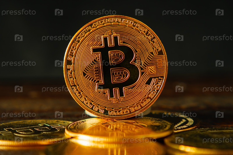 Золотая монета BTC стоит среди разбросанных монет на темном деревянном фоне.Криптовалюта биткоин. Технология блокчейн. Большой план