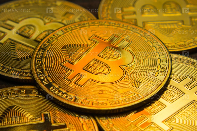 Большой план монеты биткоин в красивом желтом свете. криптовалюта BTC вид сверху. технология блокчейн