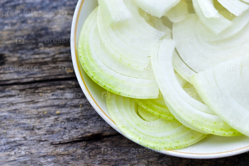 Нарезанный белый лук в блюдце на деревянной доске