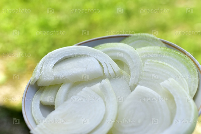 Нарезанный белый лук в блюдце на зеленом фоне