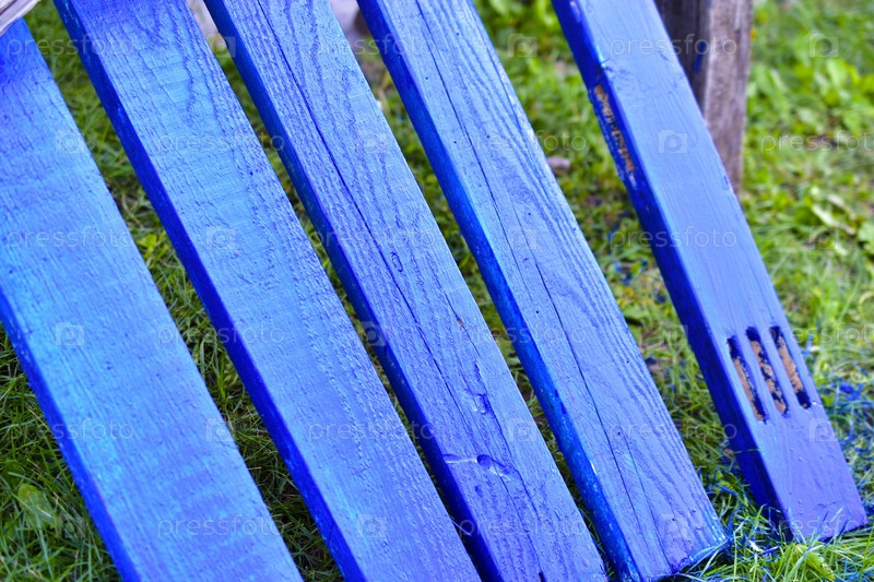 Свежеокрашенные синие деревянные доски на траве