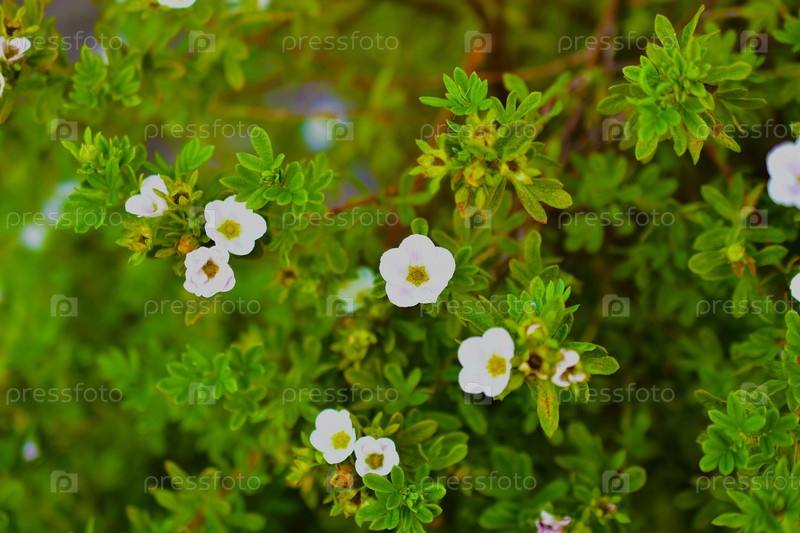 Белые цветы лапчатки (лат. Potentilla) на зеленом кусте