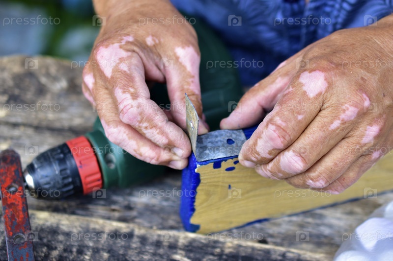Руки мастера с дефектами и пятнами с дрелью и продуктом