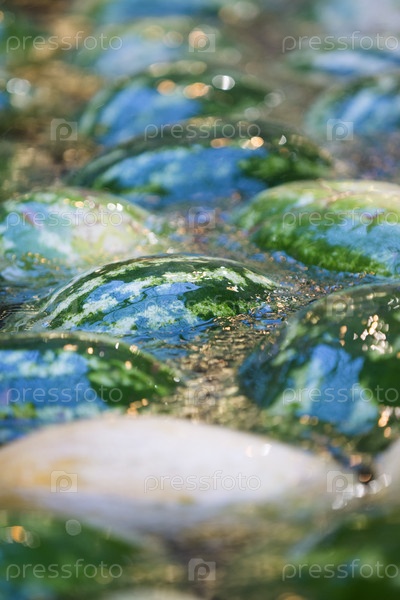Россия. Санкт-Петербург. Голуби лежат в холодной воде на рынке. Россия. Санкт-Петербург. Арбуз лежит в холодной воде на рынке