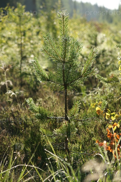 Россия. Ленинградская область. Росток ели в просеке в лесополосе. Россия. Ленинградский регион. The sprout of a spruce tree in a clearing in a forest belt