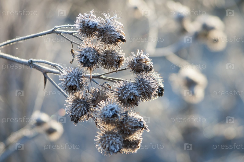 Россия. Санкт-Петербург. Паутинообразный лопух (репейник) в морозном льду. Россия. Санкт-Петербург. Spider burdock (burdock) in frosty frost