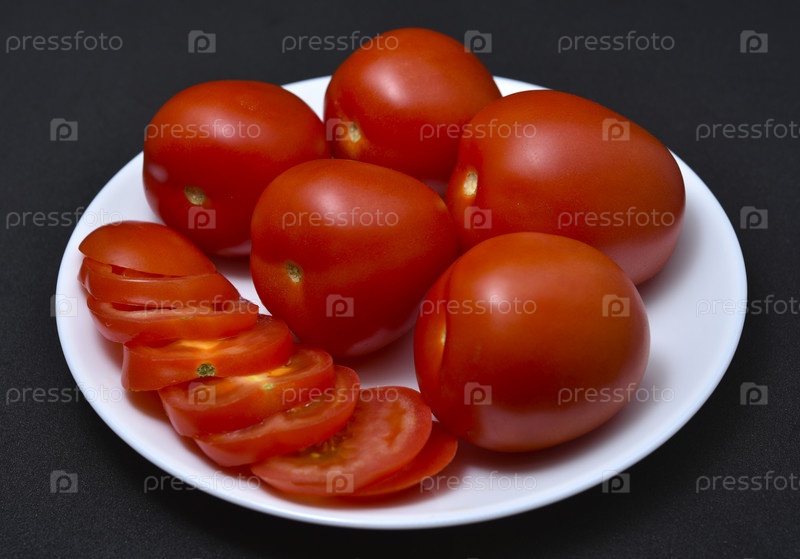 Красные помидоры на белой тарелке. Нарезанные помидоры. Овощи на тарелке