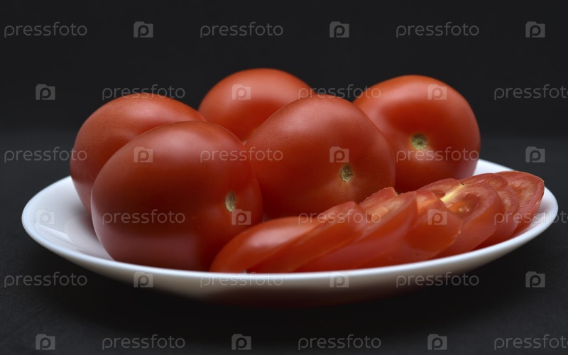Красные помидоры на белой тарелке. Нарезанные помидоры. Овощи на тарелке