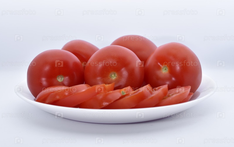 Красные помидоры на белой тарелке. Нарезанные помидоры на белом фоне. Овощи на тарелке