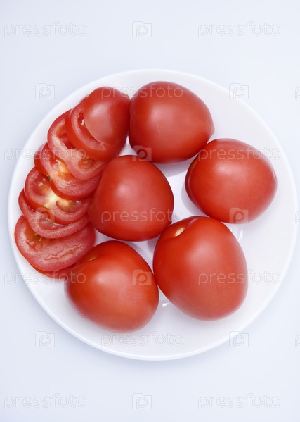 Красные помидоры на белой тарелке. Нарезанные помидоры на белом фоне. Овощи на тарелке