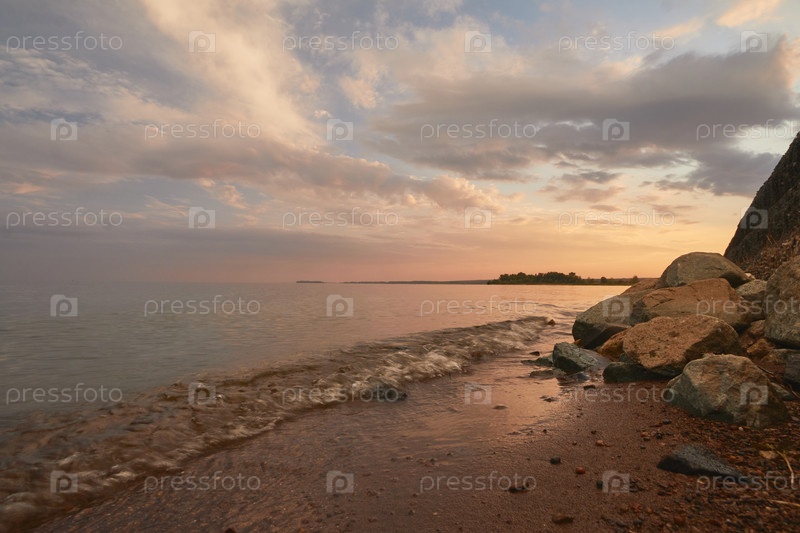 Закат над рекой, широкий угол обзора, выборочный фокус