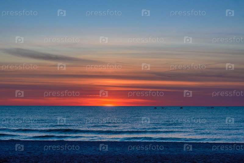 Эффектный яркий золотой закат над Балтийским морем на песчаном пляже