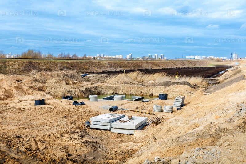 Соединение траншейного водостока с бетонной конструкцией люка на строительной площадке. Бетонная свая в каркасе опалубки для устройства ливневых и подземных коммуникаций, насосных станций, канализационных труб