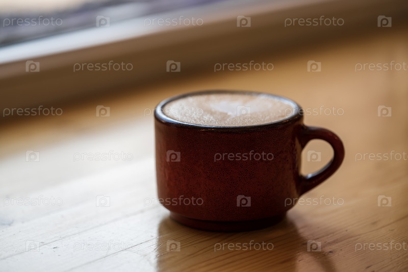 Кофейная чашка на деревянном столе перед окном