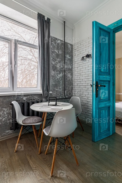 Интерьер квартиры в старинном стиле, с высокими потолками и старой деревянной дверью бирюзового цвета