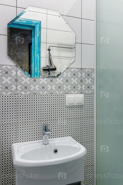Ванная комната с белой плиткой, зеркалом и умывальником
