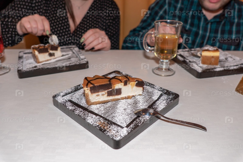 Сливочный чизкейк с шоколадной глазурью на темной тарелке