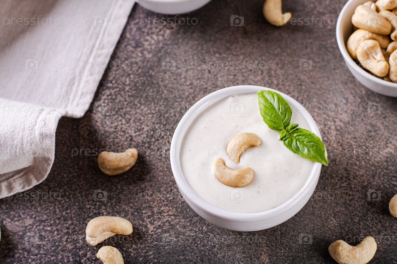 Свежий соус кешью с базиликом в миске для вегетарианской диеты