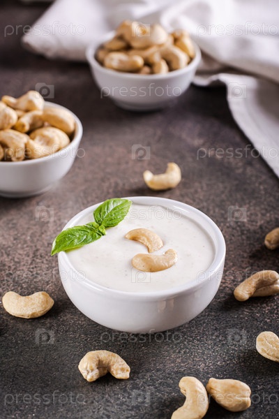 Веганский соус из кешью в миске с базиликом на столе для растительной диеты, вертикальный вид