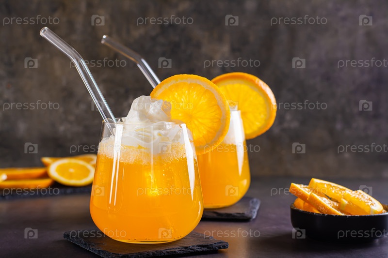 Свежий коктейль с апельсиновой газировкой в стаканах на столе