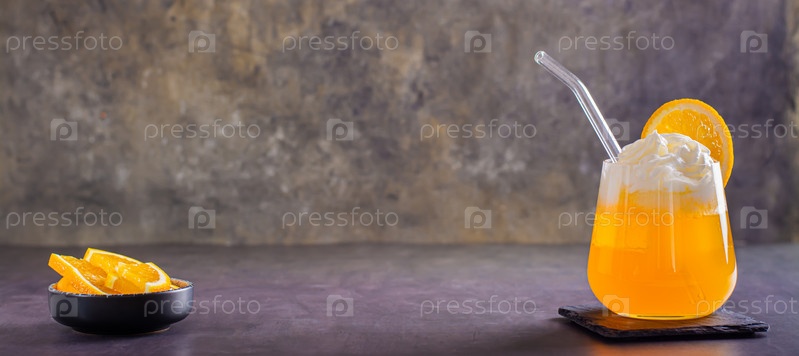 апельсиновая газировка со взбитыми сливками в стаканах и дольками апельсина на веб-баннере стола