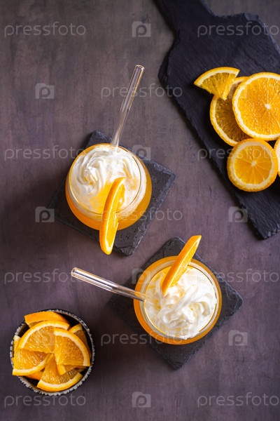 апельсиновая газировка со взбитыми сливками в стаканах и дольками апельсина на столешнице и вертикальный вид