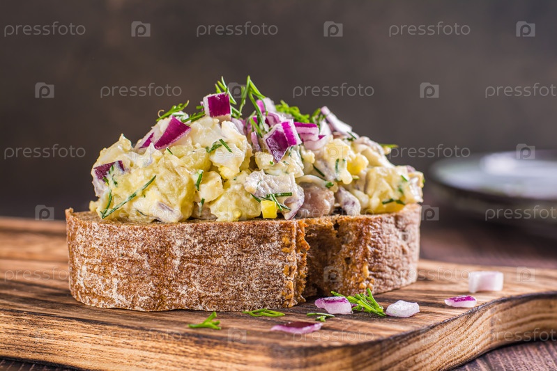 Крупный план сэндвича из ржаного хлеба со шведским салатом на деревянной доске