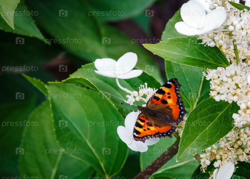 Оранжевая бабочка aglais urticae на ветке гиртензийного куста