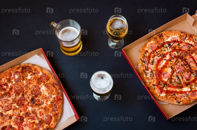 Пиво и свежеиспеченная пицца в коробках на темном фоне