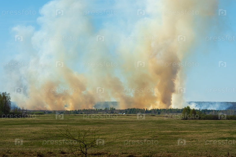 Бушующий лесной пожар за горизонтом, огонь угрожает домам, стоящим на опушке леса, размытый фокус